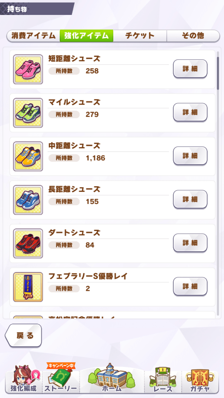 Read Moreウマ娘育成で完遂したキャラについてメモ。難易度ゲキムズのキングヘイローは1度挫折してそのまま。以前の記事の続編。 今回は逃げキャラ以外も多く作成した。 前回からの育成方針の変化 たづな フレンド枠のたづなを凸1から完凸LV50に変更した。変更してから同キャラを育てていないので最終能力の差異ははっきり …